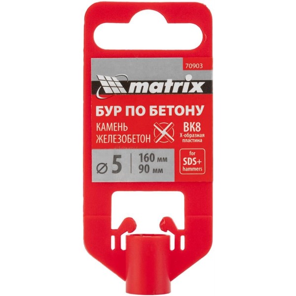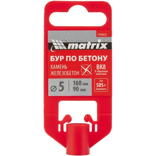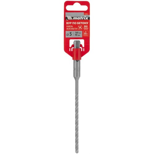 Бур по бетону Matrix 70903 длиной 160 мм, с хвостовиком SDS-plus и крестовой пластиной, предназначен для получения отверстий диаметром 5 мм в бетоне, камне и кирпиче. Крестовая пластина обеспечивает эффективную работу с твердыми материалами, в том числе армированным бетоном. Бур устанавливается в патрон перфоратора и используется во время проведения строительных работ.
