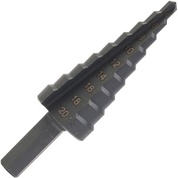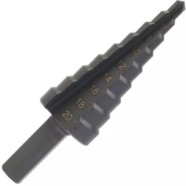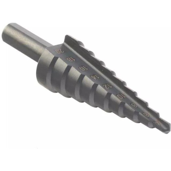 Сверло по металлу ступенчатое 4-20 мм PATRIOT 815010702 - для сверления отверстий в профильных и листовых материалах из стали, цветных мелаллов и пластика толщиной до 5 мм. Благодаря плавному ступенчатому переходу и возможности сразу снять фаску отверстие получается аккуратным и имеет ровные края. Трехгранный хвостовик предотвращает проскальзывание сверла в патроне. Характеристики: Диаметр отверстия - 9 ступеней, 4-20 мм. Шаг - 2 мм. Для инструмента - дрель, дрель-шуруповерт. Тип сверла - ступенчатое.