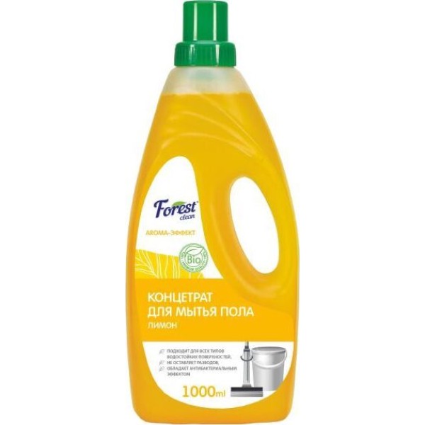 FOREST CLEAN Концентрат для мытья пола "Лимон" 1000 мл Жидкое, щелочное, низкопенное, ph-нейтральное в готовом растворе моющее средство с хорошим обезжиривающим действием. Эффективно против загрязнений на полимерных покрытиях, кафеле, керамике, стекле, пластмассах, мармолеуме и линолеуме, ПВХ-плитке, терраццо, натуральном и искусственном камне, бетоне, нержавеющей стали и других металлах, дереве, окрашенных поверхностях, подходит для ламината. Способ применения: для приготовления рабочего раствора на 10 л. воды необходимо добавить 50-100 мл. концентрата. Для механизированной уборки перед первой заправкой необходимо тщательно промыть бак машины от предыдущего моющего средства.