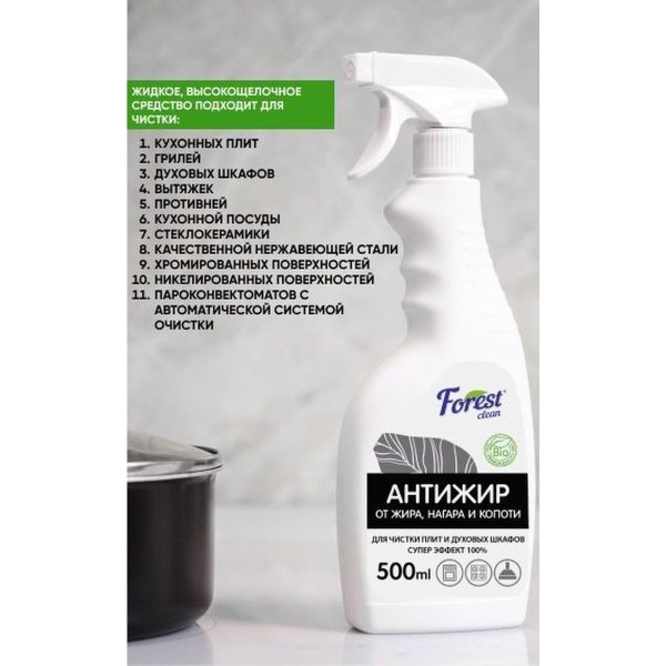 FOREST CLEAN Антижир 500 мл Жидкое высокощелочное средство для удаления жира, нагара, копоти, для ручной чистки кухонных плит, грилей, духовых шкафов, вытяжек, противней, вытяжных зонтов, фритюрниц и жарочного оборудования. Антижир / антипригар / жироудалитель эффективно очищает от пригоревших и присохших жиров, масел, сахара на стеклокерамике, качественной нержавеющей стали, хромированных, никелированных и других поверхностях. Удаляет неприятные запахи, загрязнения от нефтепродуктов. Легко смывается, не оставляя плёнок, царапин, разводов, а также препятствует повторному осаждению загрязнений. Не оставляет царапин и разводов. Удобно использовать при чистке вертикальных поверхностей. При очистки грилей, плит, жарочного оборудования, вытяжек и другого оборудования необходимо распылить средство на охлажденную поверхность и через 5-15 минут разтереть и удалить грязь губкой, смыть водой и вытереть насухо. Во время применения использовать перчатки.