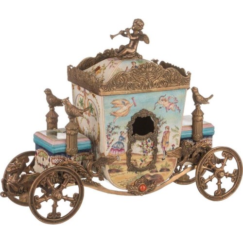 Изысканное декоративное изделие "Карета"словно пришла к нам из дворцовой эпохи XVIII века. Она так и сделана – вручную, под старину, с соблюдением традиций и технологий, которые складывались веками. Даже трещины на некоторых изделиях создавались специально и по особой технологии, чтобы передать винтажную атмосферу этих серий. Сегодня похожие предметы интерьера редко где встретишь - разве что в музеях или частных антикварных коллекциях.