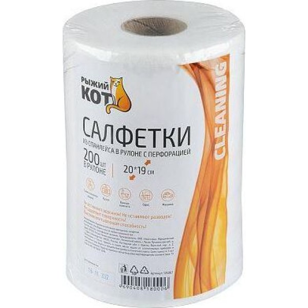 РЫЖИЙ КОТ Салфетки из спанлейса в рулоне с перфорацией 20*19см, 35 гр/м2, 200 шт (105067)