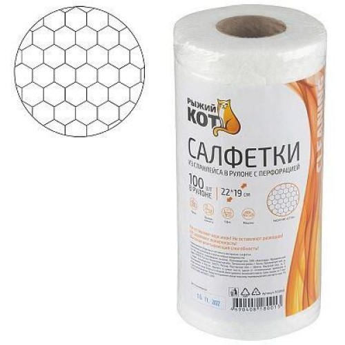РЫЖИЙ КОТ Салфетки из спанлейса в рулоне с перфорацией 22*19см, 40гр/м2, соты, 100 шт. (105068)
