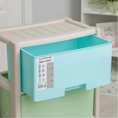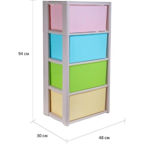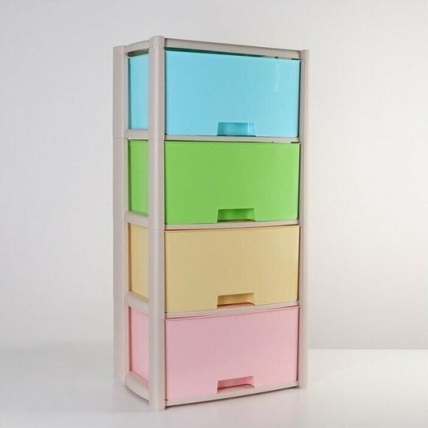 Комод "Колорит" цветной, 4-х секционный, Вес 4.012 кг, Размеры изделия (ДхШхВ) 475х300х940 мм. Комод произведен из высококачественного и безопасного полипропилена. Особую прочность комоду придает его цельная конструкция перегородок. Комод имеет выдвижные и достаточно вместимые ящики. На крышке и перегородках предусмотрены ограничители, благодаря которым ящик не будет вылетать при открывании. Такой комод станет отличным решением для организации хранения практически в любой комнате вашей квартиры или дома. Благодаря цветовому решению и современному дизайну, комод гармонично впишется в интерьер любой комнаты. Благодаря небольшому весу и компактному размеру, комод легко устанавливается и передвигается. Комод упаковывается в индивидуальную упаковку и будет поставляться уже в собранном виде.