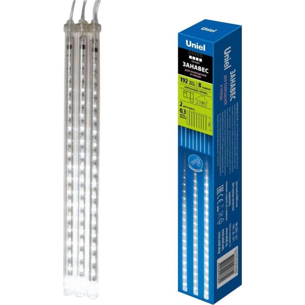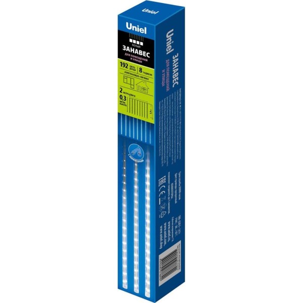 Срок службы 30 000 ч, Тип занавес, Мощность 4,8 Вт, Длина 2,4 м, Класс защиты IP 44, Свет синий, Входное напряжение 220-240 В, Диапазон рабочих температур -30 +35 °С, Количество светодиодов 144 шт, Назначение декоративная подсветка, Размеры 2400х300 мм, Частота 50-60 Гц.