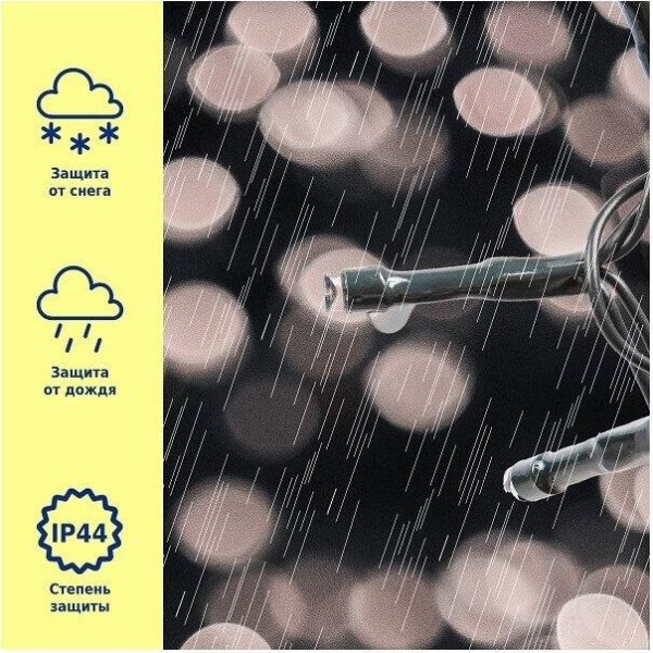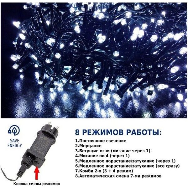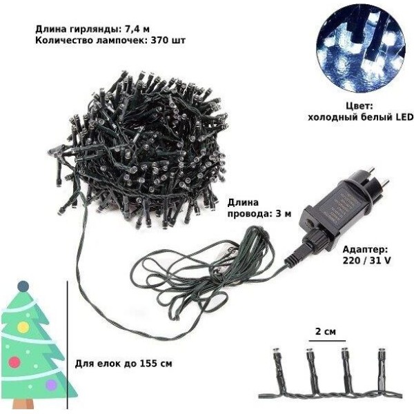 Длина гирлянды: 740 см. Длина провода: 3 м. Подходит для елки: 155 см. Количество лампочек: 370 штук. Цвет лaмпочек: холодный белый LED. Расстояние между лампочками: 2 см. Цвет проводa: темно-зеленый. Количество режимов: 8 штук. Питaние: адaптер (входящeе нaпряжение - 220V; иcходящее - 31V). Применение: внутри/снаружи помещения.