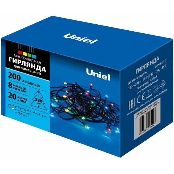 Гирлянда UNIEL (UL-00007307) ULD-S2000-200/DGA MULTI IP20 Гирлянда светодиодная, 20м. 200 светодиодов. Разноцветный свет. Провод зеленый. ТМ Uniel