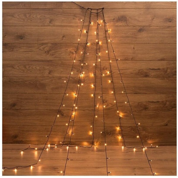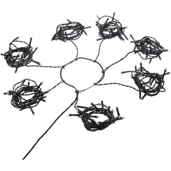 "Елочная гирлянда представляет собой конструкцию, в основании которой расположено кольцо, на котором через определенные промежутки крепятся 7 нитей по 1,8 метра. Данная гирлянда предназначена для домашнего использования и идеально подойдет для украшения елок. Просто повесьте кольцо на вершину елки, расправьте нити и готово! Данная гирлянда имеет длину 1,8 м, цвет свечения светодиодов теплый белый."