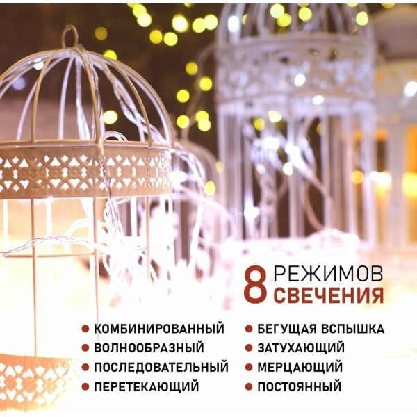 бегущая вспышка, Благодаря встроенному контроллеру, гирлянда имеет 8 разнообразных режимов свечения: комбинированный, волнообразный, последовательный, перетекающий, затухающий, мерцающий, постоянный. Длина шнура подключения составляет 3 метра