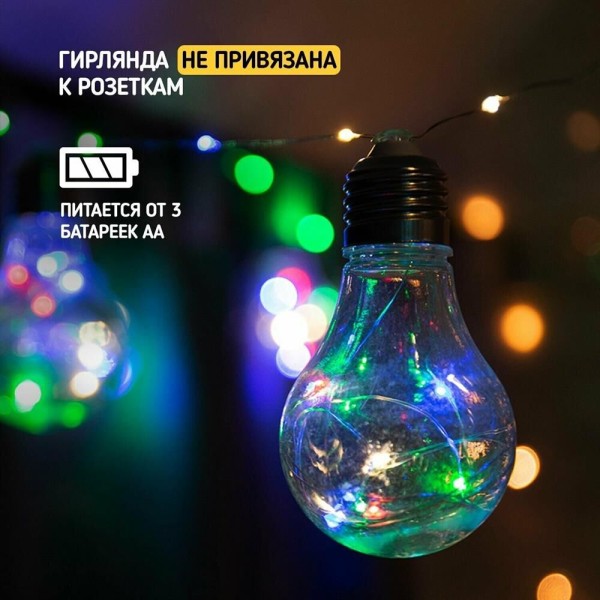 Стильное и необычное решение для украшения интерьера не только в новогодние праздники, но и в повседневной жизни. Гирлянда длиной 3 м и с питанием от батареек 3*АА (батарейки в комплект не входят). Расстояние между лампочками 30 см. Имеет кнопку ON/OFF.