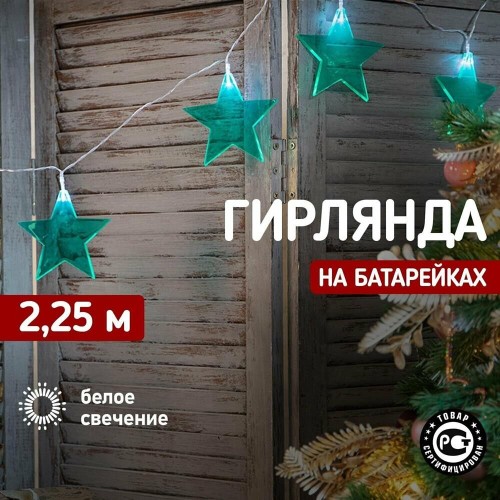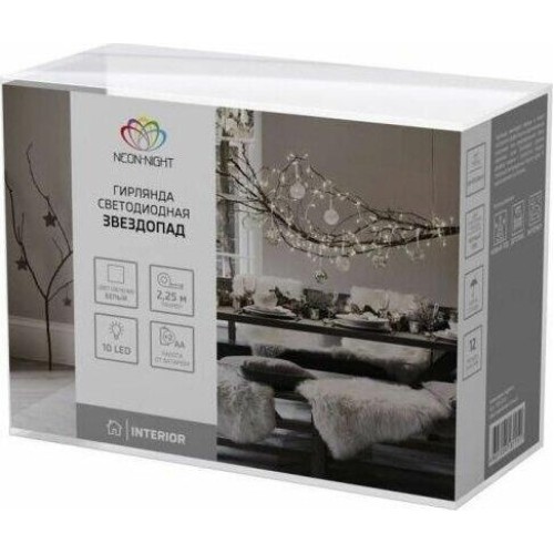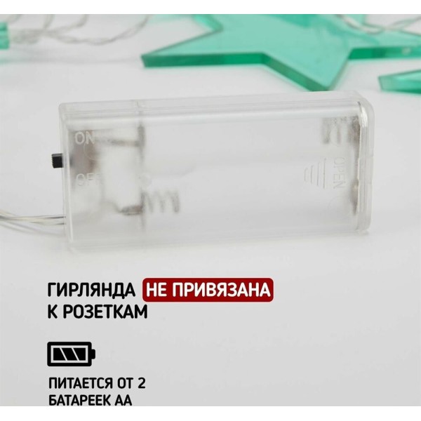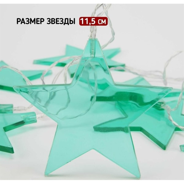 "Светодиодная гирлянда «Звездопад» NEON-NIGHT станет прекрасным решением для создания праздничной атмосферы и уюта в интерьере. С помощью гирлянды можно украсить карниз в спальне, стены в детской, фотозону или даже офисное помещение. Благодаря яркому дизайну можно создать стильный интерьерный акцент даже в выключенном состоянии. Всего на гирлянде 10 бирюзовых звезд, светящихся белыми диодами, расположенных на расстоянии 16,67 см друг от друга. Работает от 2 батареек типа АА (не в комплекте)."