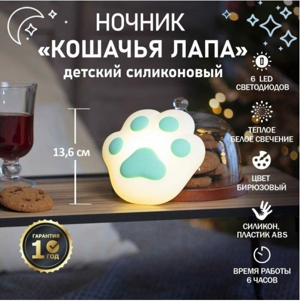 Силиконовый ночник «Кошачья лапа», выполненный в бирюзовом цвете, станет верным помощником вашего ребенка, способным настроить на быстрое засыпание и безмятежный комфортный сон. Изделие произведено из безопасного силикона, который вызывает только приятные ощущения при прикосновении. Ночник заряжается через USB-порт, время работы от одного заряда 6 часов. Для фиксации на поверхностях можно воспользоваться двухсторонним скотчем, а встроенный магнит надежно удержит небольшой вес на любых металлических основаниях. Один режим работы предусматривает постоянное белое свечение теплого оттенка.