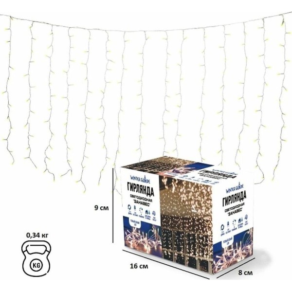 Электрическая гирлянда-занавес Winter Glade станет замечательным украшением дома в период новогодних и рождественских праздников. Мерцающий свет лампочек подарит сказочное праздничное настроение. • Длина гирлянды: 150 см • Длина нитей: 90 см • Длина провода: 3 м • Количество лампочек: 195 штук • Цвет лaмпочек: теплый белый LED • Расстояние между лампочками: 7-7,5 см • Цвет проводa: прозрачный • Количество режимов: 8 штук • Питaние: адaптер (входящeе нaпряжение — 220V; иcходящее — 31V) • Применение: внутри/снаружи помещения • Размер индивидуальной коробки: 9х8х16 см • Размер транспортной коробки: 33,5х28,5х33,5 см • Количество штук в коробке: 24 шт • Вес нетто: 340 г • Вес брутто: 370 г • Производитель: Winter Glade • Страна: Китай