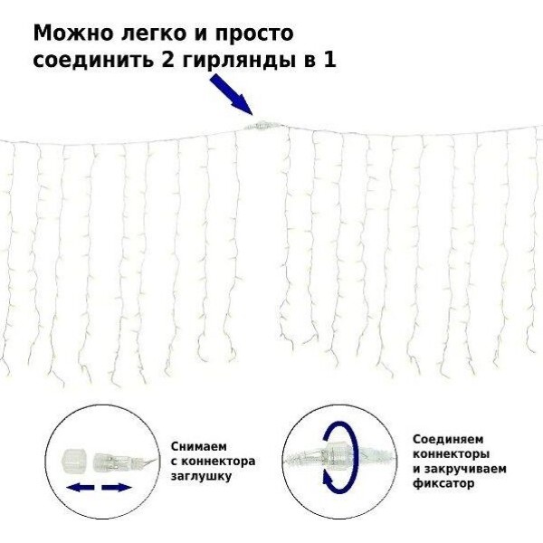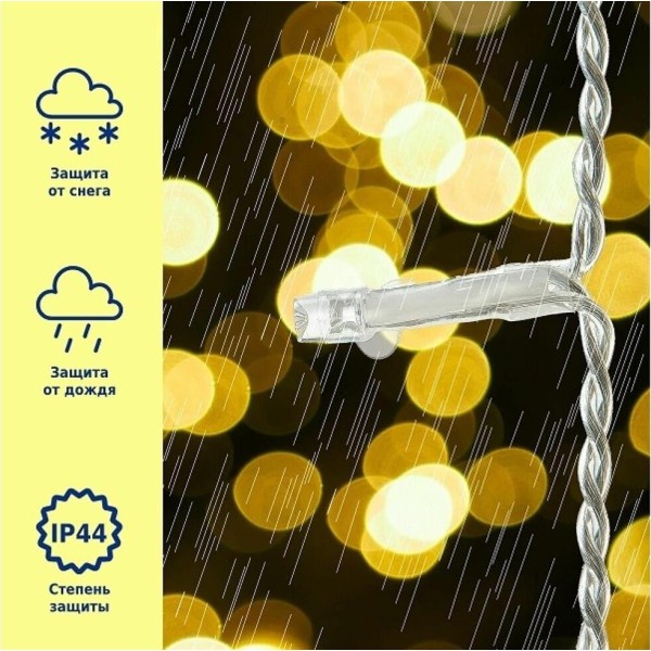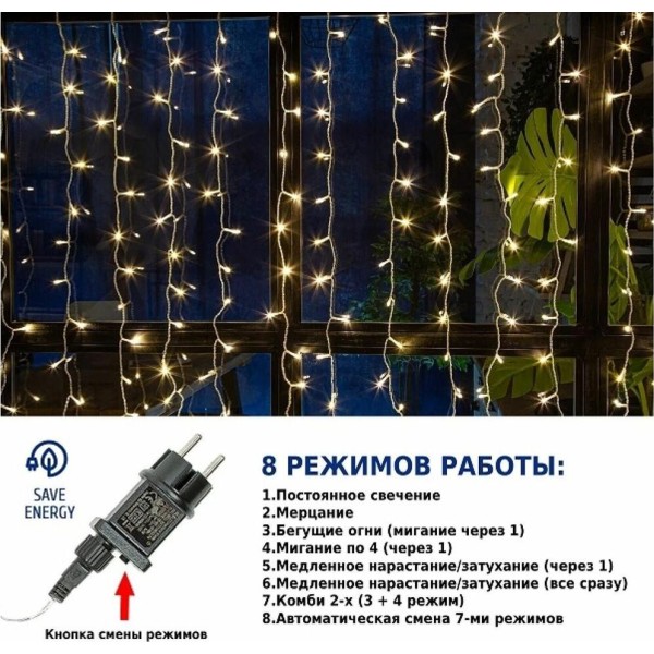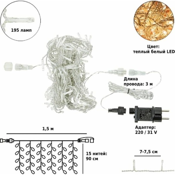 длина нитей 90 см; расстояние между лампочками 7-7,5 см; длина провода: 3 м; питaние: адaптер (входящeе нaпряжение - 220V; иcходящее - 31V); вес брутто: 370 г