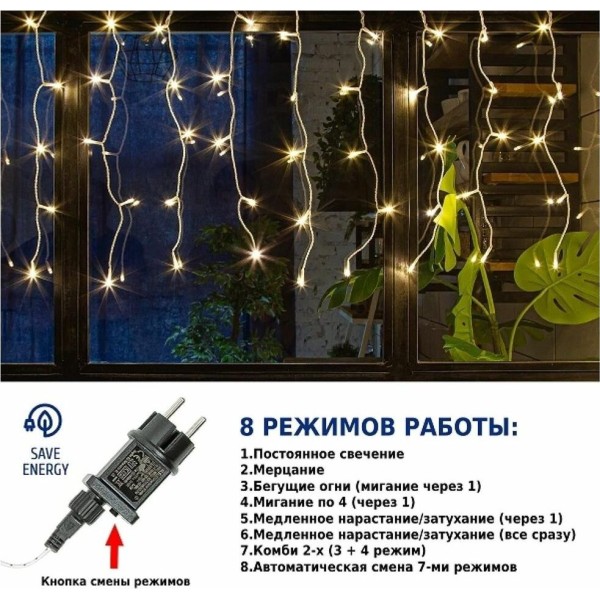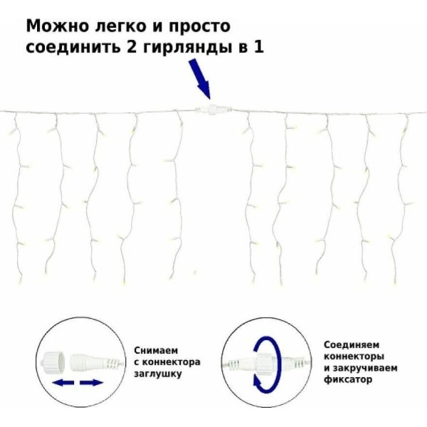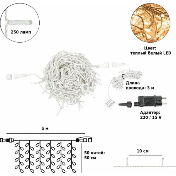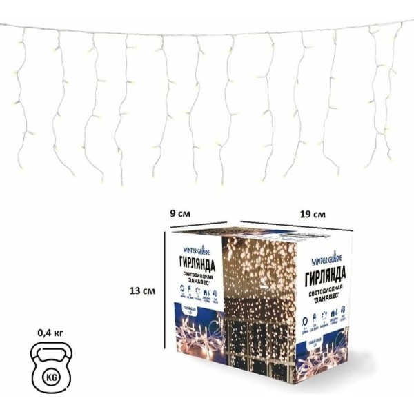 Электрическая гирлянда-занавес Winter Glade станет замечательным украшением дома в период новогодних и рождественских праздников. Мерцающий свет лампочек подарит сказочное праздничное настроение. • Длина гирлянды: 500 см • Длина нитей: 50 см • Длина провода: 3 м • Количество лампочек: 250 штук • Цвет лaмпочек: теплый белый LED • Расстояние между лампочками: 10 см • Цвет проводa: белый • Количество режимов: 8 штук • Питaние: адaптер (входящeе нaпряжение — 220V; иcходящее — 31V) • Применение: внутри/снаружи помещения • Размер индивидуальной коробки: 13х9х19 см • Размер транспортной коробки: 40,5х37,5х39,5 см • Количество штук в коробке: 24 шт • Вес нетто: 400 г • Вес брутто: 430 г • Производитель: Winter Glade • Страна: Китай