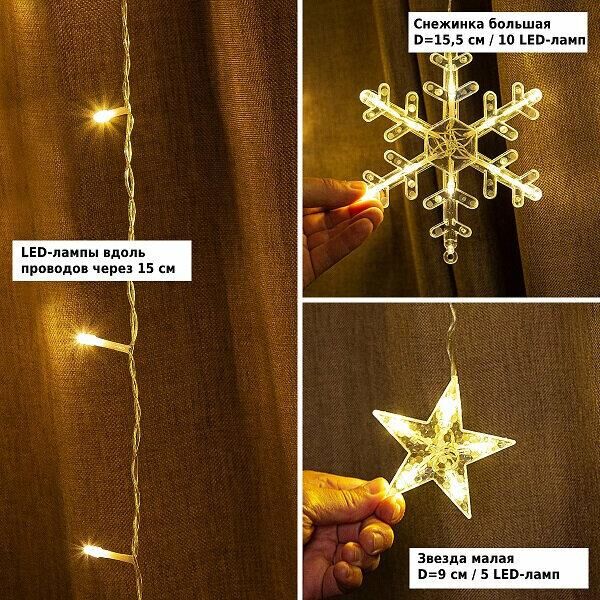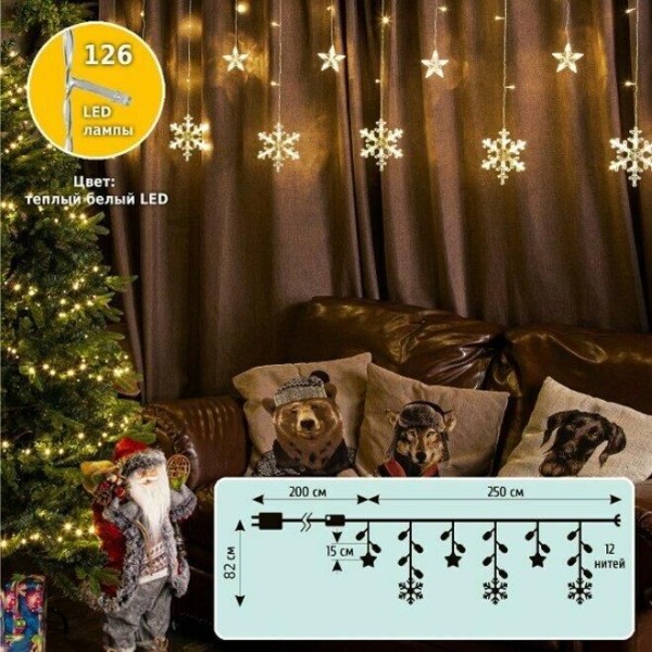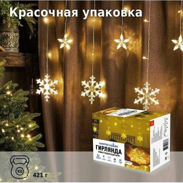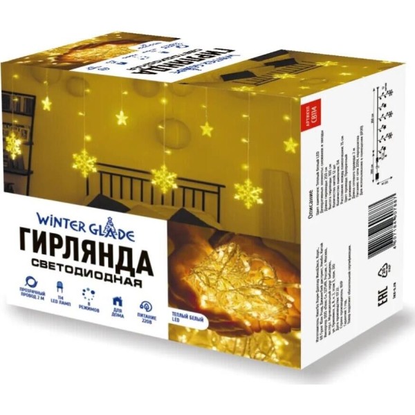 Электрическая гирлянда-занавес CB114 Winter Glade станет замечательным украшением дома в период новогодних и рождественских праздников. Мерцающий свет лампочек подарит сказочное праздничное настроение. • Длина гирлянды: 250 см • Длина нитей: 48-82 см • Длина провода: 2 м • Количество лампочек: 126 штук • Количество нитей: 12 штук • Цвет лaмпочек: тёплый белый LED • Расстояние между лампочками: 15 см • Цвет проводa: прозрачный • Количество режимов: 8 штук • Питaние: 220V • Применение: внутри помещения • Размер индивидуальной коробки: 22х11х20 см • Размер транспортной коробки: 57х46х62 см • Вес нетто: 351 гр • Вес брутто: 421 гр • Производитель: Winter Glade • Страна: Китай