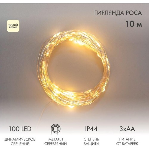 Гирлянда NEON-NIGHT (303-256) Гирлянда Роса 10м, 100LED, цвет свечения теплый белый, IP44, на батарейках 3хАА, с пультом 8 режимов