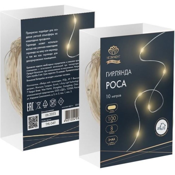 Гирлянда Роса – это декоративный элемент, который представляет собой нить с маленькими светодиодами, напоминающими капельки росы. Нить гирлянды выполнена из тонкого проволочного материала, который легко гнется и сохраняет нужную форму, благодаря чему Роса может преобразить любой предмет, сделав его уникальным интерьерным украшением. Вы также можете использовать гирлянду для украшения одежды. Изделие работает от трех батареек типа АА, что дает возможность свободно размещать ее в любом месте, вне зависимости от наличия розетки. Батарейки обеспечивают длительное время работы и удобство в использовании. В комплекте поставляется пульт управления, который позволяет выбрать один из восьми доступных режимов свечения. Гирлянда Роса создаст прекрасную атмосферу и станет настоящей находкой для любителей уютного интерьера.
