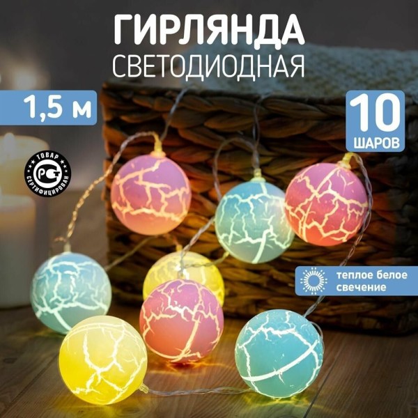 Гирлянда светодиодная Карамельки – это прекрасное декоративное решение, которое добавляет веселый и игривый акцент к любому интерьеру. Гирлянда выполнена в виде серебристого шнура длиной 1,5 метра в прозрачной изоляции из ПВХ, на котором размещены разноцветные насадки в виде шариков диаметром 6 см. В качестве источника питания гирлянды выступает USB-разъем, который крепится на дополнительный провод длиной 30 см.