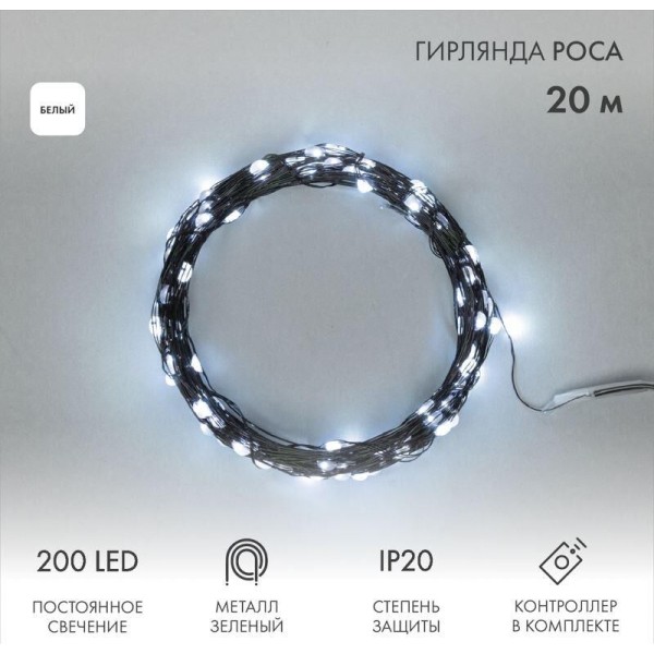 Гирлянда NEON-NIGHT (303-265) Гирлянда светодиодная Роса с контроллером 20м, 200LED, БЕЛЫЙ, IP20, 230В, зеленый провод