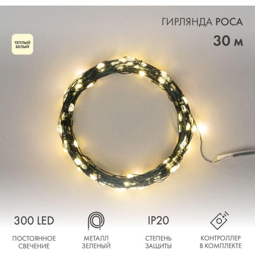 Гирлянда NEON-NIGHT (303-276) Гирлянда светодиодная Роса с контроллером 30м, 300LED, ТЕПЛЫЙ БЕЛЫЙ, IP20, 230В, зеленый провод