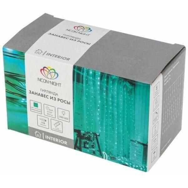 Гирлянда NEON-NIGHT (315-984) ДОЖДЬ ИЗ РОСЫ 3х3 м, 300 LED, бирюзовый, IP20, USB + пульт управления