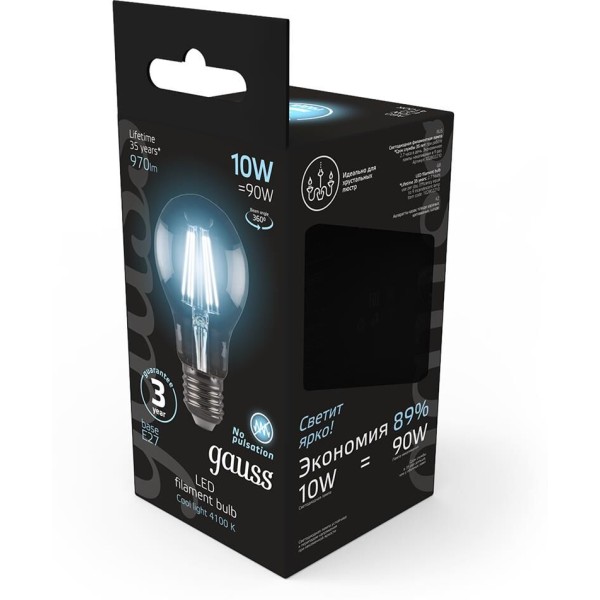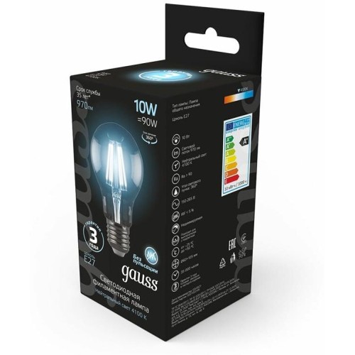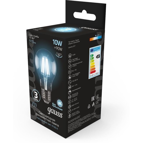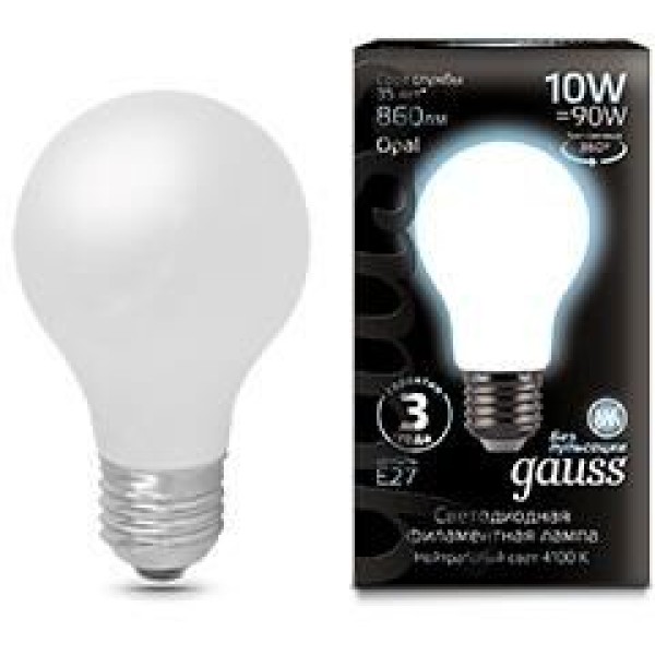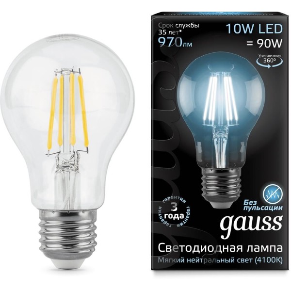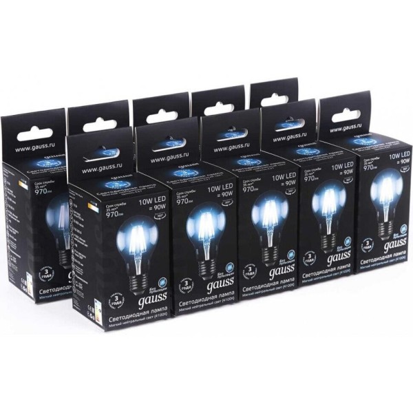 GAUSS Лампа филам. Filament A60 10Вт цок.:E27 груша 220B 4100K св.свеч.бел.нейт. (упак.:1шт) (102802210)