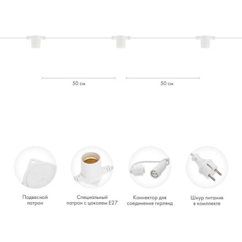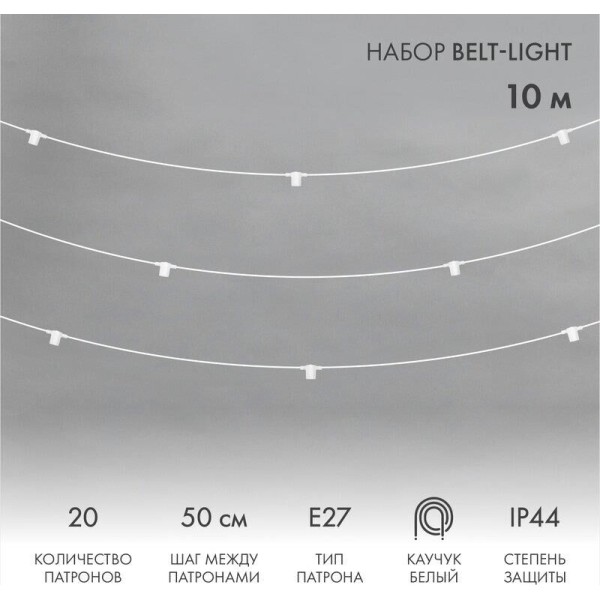 Светильники накладные NEON-NIGHT (331-332) 'Белт-Лайт' 2 жилы 10 м, белый каучук, шаг 50 см, 20 патронов Е27, шнур 3 м, IP44, соединяется