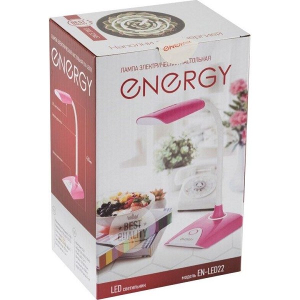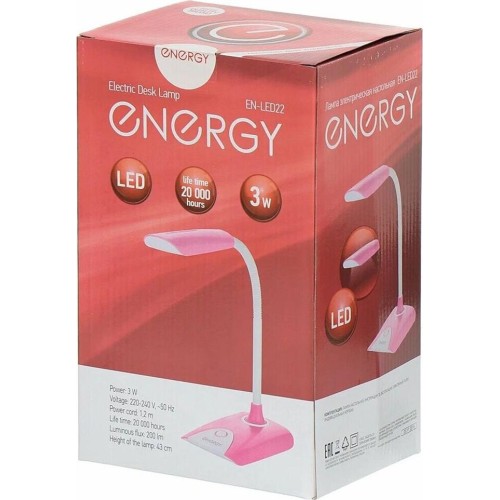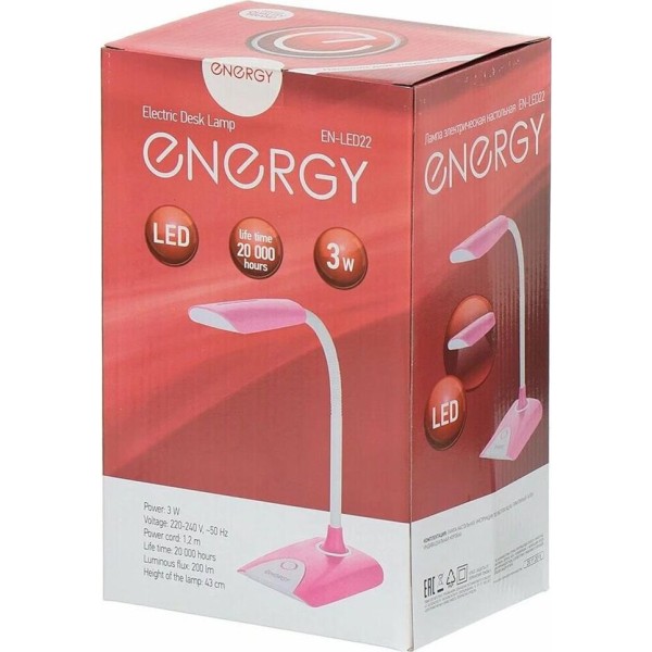 Лампа электрическая настольная ENERGY EN-LED22, бело-розовая. Мощность: 3 Вт Длина шнура: 1,2 м. Световой поток: 200 лм. Состав (материал): пластик, металл.