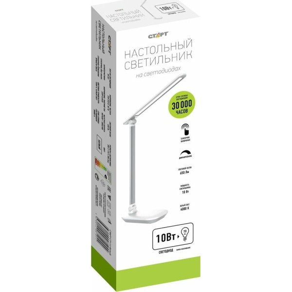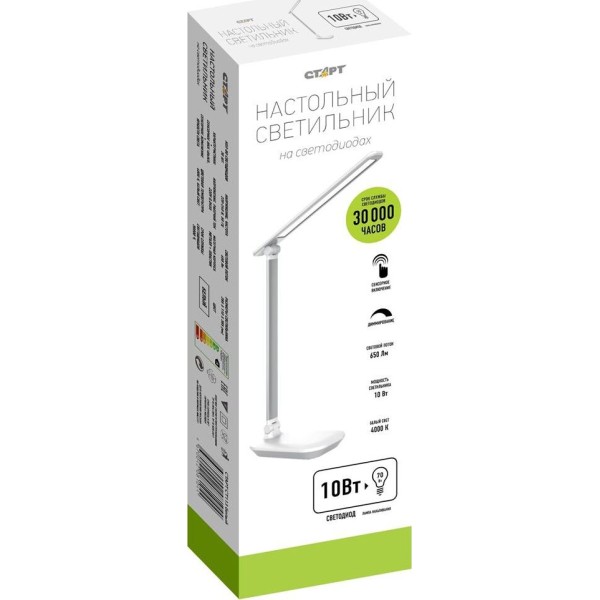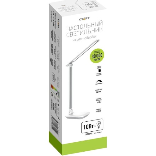 Потребляемая мощность 10W Световой поток 650Лм Материал корпуса металл + пластик Сенсорный выключатель, с диммером Длина шнура 1,5м Цвет: белый Размер: 285*110*385мм