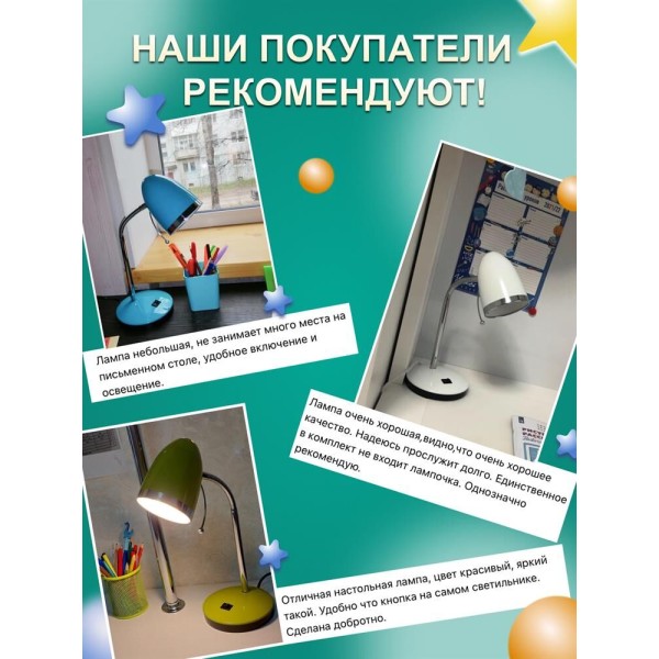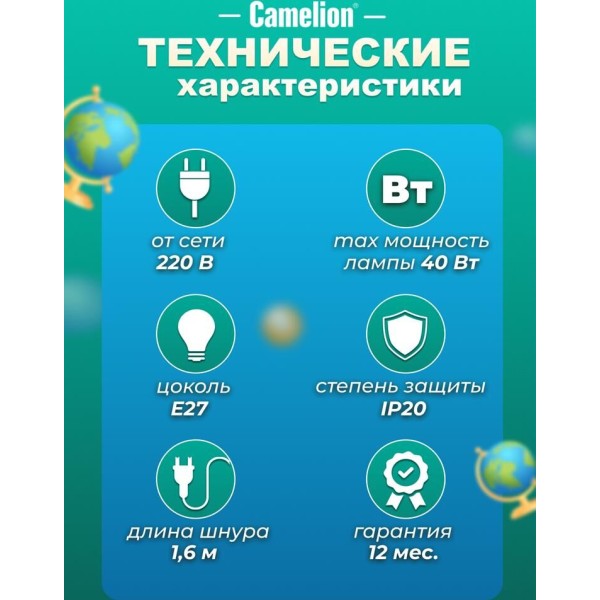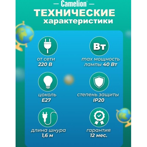 Настольный светильник Camelion KD-308 C16 зеленый, размер 150х150х240мм, источник света - ЛОН, тип лампы - 40/A/Е27, патрон - E27, мощность 40Вт, ~230 В, 50 Гц.