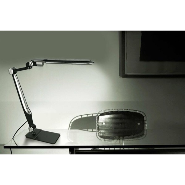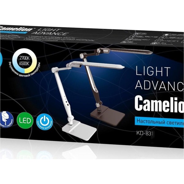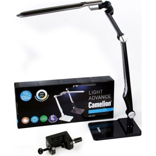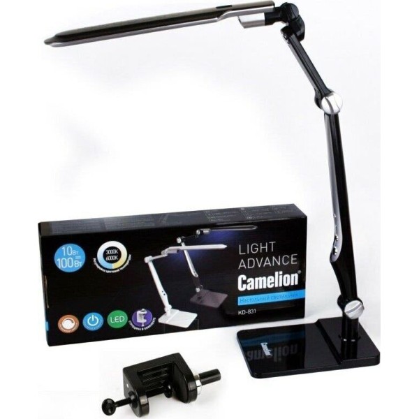 Настольный светодиодный светильник (струбцина+основание) KD-831 C02 черный, размер 458х196х78мм, источник света - встроенные светодиоды, мощность 10Вт, питание 230 В, 50 Гц, световой поток - 600лм, пластик, длина провода 1,35 м. Регулировка цветовой температуры 3000-6000К.