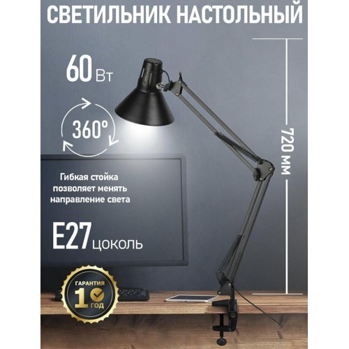 Настольный светильник REXANT используется для освещения рабочего места, места чтения или учебы. Благодаря лаконичному дизайну и мягкому приятному свечению светильник создаст неповторимый уют как в офисе, так и дома. Корпус светильника выполнен из высококачественного металла. Винтовой зажим позволяет прочно фиксировать светильник как на стол, так и на спинку кровати и на прочие предметы мебели, а гибкая стойка позволяет менять направление света на 360°. Светильник с керамическим патроном Е27 используется со всеми видами ламп: с лампами накаливания до 60 Вт, с энергосберегающими и светодиодными лампами. Работает от стандартной сети 220 В и не требует дополнительных элементов питания. Максимальная мощность лампы: 60 Вт Напряжение: 220 В Тип цоколя: Е27 Встроенный механический выключатель Размеры: 720х165х170 мм Тип крепления: винтовой зажим Цвет: антрацит Класс электробезопасности: II Тип питания: от сети 220 В Длина шнура: 1 м