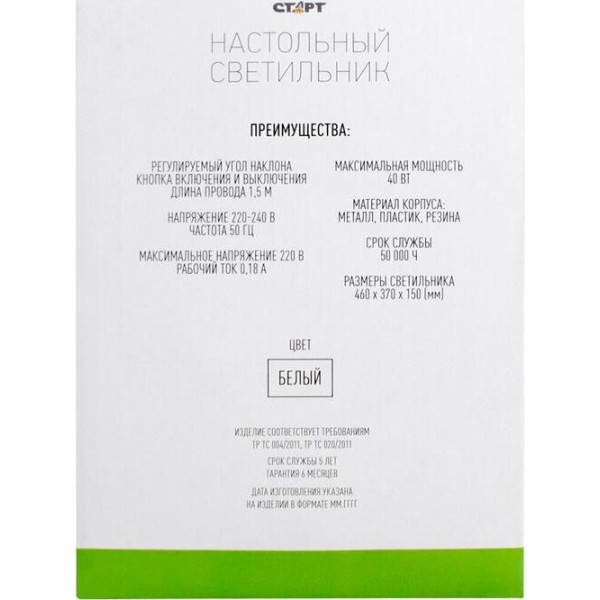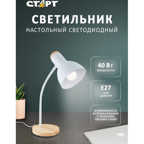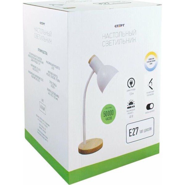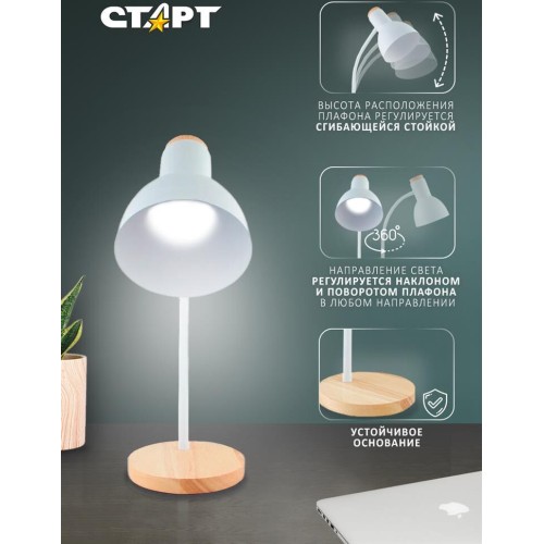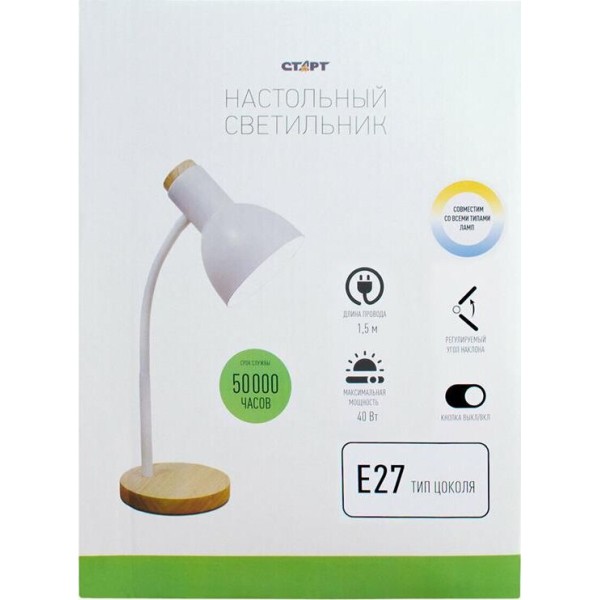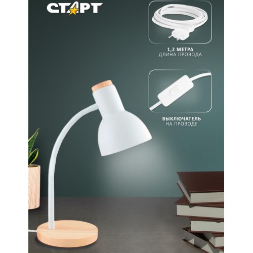 Максимальная мощность: 40 Вт Тип цоколя: E27 Возможность использования с разными типами ламп Длинна провода 1,2 м. Выключатель на проводе Материал: пластик/метал/дерево Размер: 450x170x150 мм Высота расположения плафона регулируется сгибающейся стойкой.