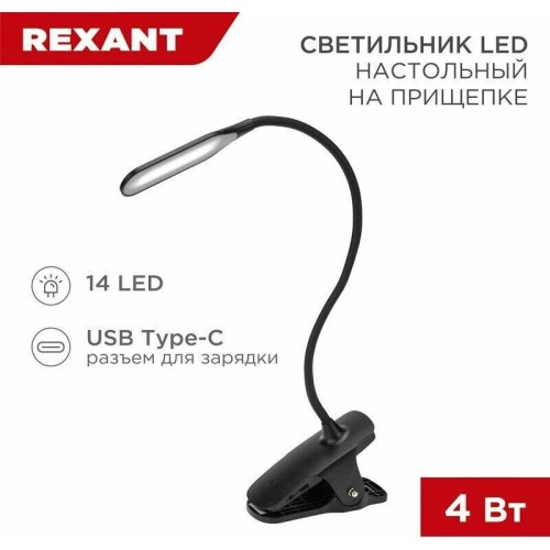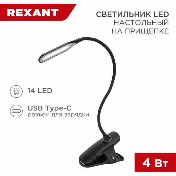 Настольный светильник REXANT используется для освещения рабочего места, прикроватной зоны. Высокое качество светодиодного источника света без пульсаций позволяет использовать светильник как в офисе, так и дома. Матовый рассеиватель обладает антиослепляющим эффектом, уменьшает габаритную яркость, создавая равномерный и мягкий свет. Предусмотрено крепление на прищепку: фиксация к торцу стола, кровати или тумбы. Зарядка осуществляется от источника питания 5 В постоянного тока (не входит в комплект) через универсальный порт micro USB (кабель в комплекте). Встроенный аккумулятор позволяет устройству работать в течение 6 часов при отсутствии внешнего питания. Характеристики: Тип источника света: LED Световой поток: 350 Лм Мощность светильника: 4 Вт Индекс цветопередачи (CRI): >80 Цветовая температура: нейтральный 4000 К Габаритные размеры: 120x62x450 мм Электромагнитная совместимость: ТР ТС 020/2011