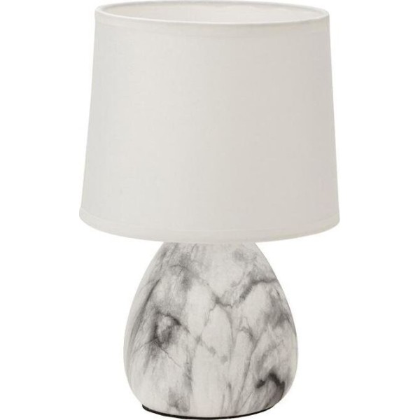 Декоративный настольный светильник с основанием цвета мрамор и белым абажуром станет современным и стильным интерьерным украшением. При производстве используются такие материалы как керамика, текстиль и металл. Светильник работает от стандартной сети 220 В и не требует дополнительных элементов питания. Оснащен патроном Е14, который совместим с лампами накаливания до 40 Вт, с энергосберегающими и светодиодными лампами. Оригинальный осветительный прибор наполнит помещение мягкостью света, создаст гармонию дизайна и атмосферу комфорта. Характеристики: Максимальная мощность лампы: 40 Вт Напряжение: 220 В Тип цоколя: Е14 Встроенный механический выключатель Размеры: 160х160х245 мм Цвет основания: белый мрамор Цвет абажура: белый Класс электробезопасности: II Тип питания: от сети 220 В Длина шнура: 1,3 м