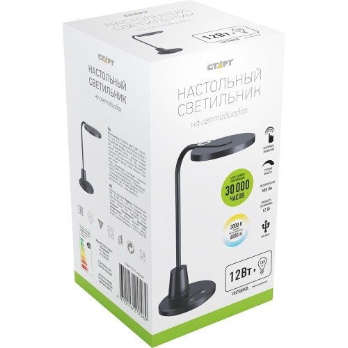 Мощность: 12 Вт Цветовая температура: 3000- 6000 K Световой поток: 500 Лм Материал: пластик/метал Размер: 166x166x490 мм Длина провода: 1,5 м Сенсорный выключатель, три уровня яркости, изменение световой температуры, подставка под телефон, USB порт 2,1 A TYPE-A для подзарядки гаджетов. Высота расположения плафона регулируется сгибающейся стойкой. Направление света регулируется наклоном и поворотом плафона в любом направлении. Устойчивое основание.