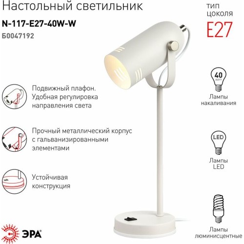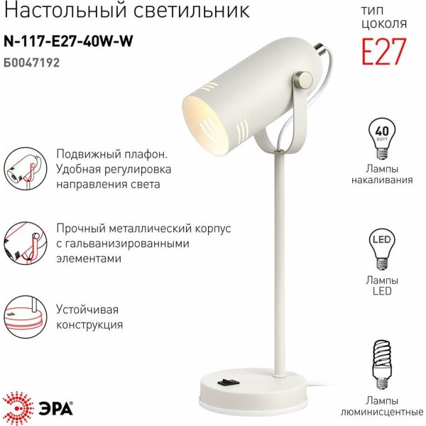 [Настольные светильники] ЭРА Б0047192 Настольный светильник N-117-Е27-40W-W белый масса(кг) 1.2 GTD Number 10131010/290421/0274348/1 GTIN 05056306014406 Cтрана-производитель Китай Партномер Б0047192 Вес, кг 0,1 Вид крепления на основании Время зарядки Нет Высота, мм 430 высота(см) 14 гарантия 1 год Диаметр внешний, мм - Диаметр, мм - Диапазон рабочих температур + 5.+40°C Длина кабеля (м) - Длина, мм - длина(см)