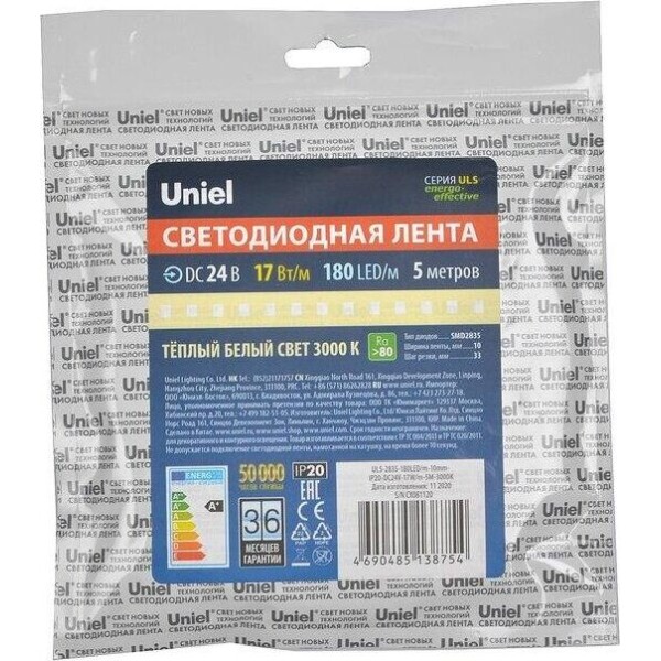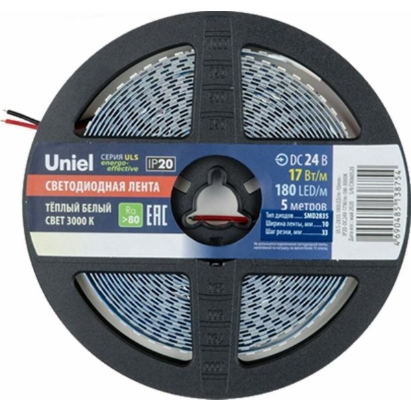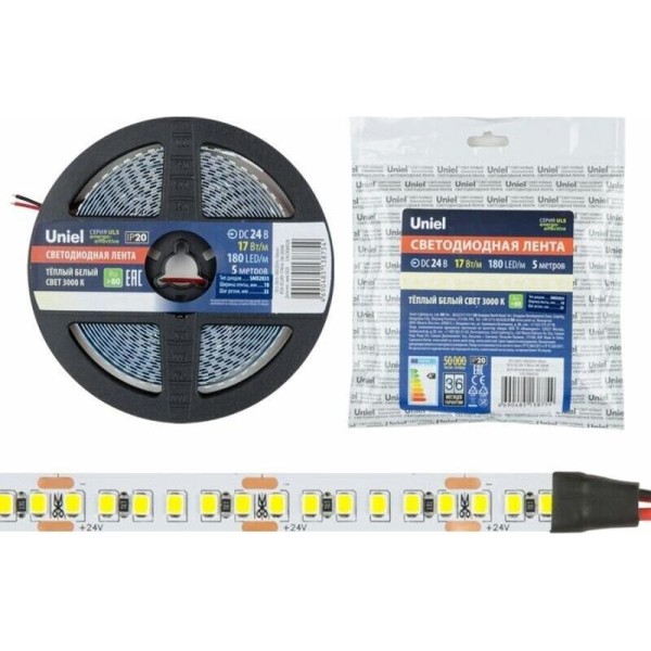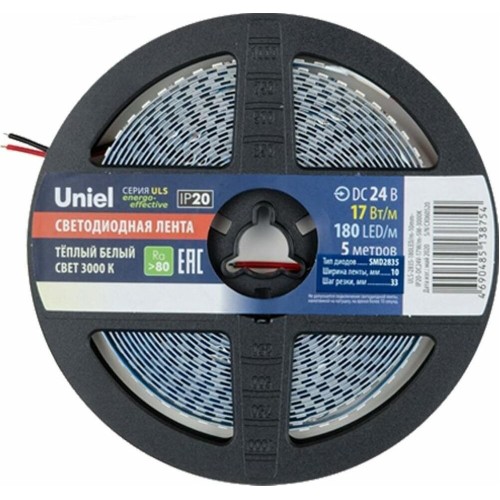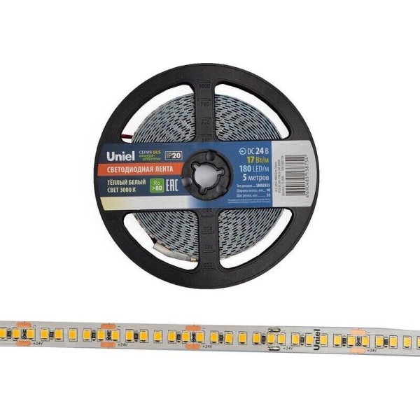 Светодиодная лента UNIEL (UL-00007642) ULS-2835-180LED/m-10mm-IP20-DC24V-17W/m-5M-3000K катушка в герметичной упаковке