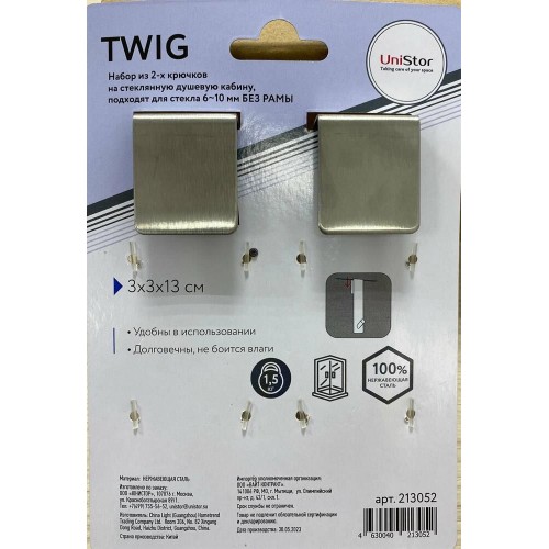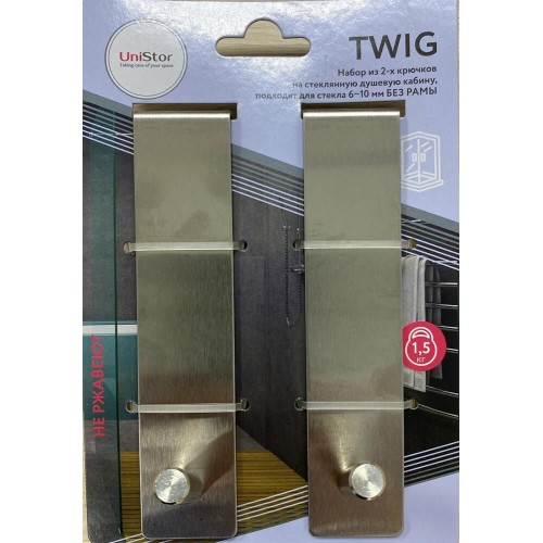 UniStor TWIG Набор из 2-х крючков на стеклянную дверь для душа. Подходит для дверей 6 ~ 10 мм БЕЗ РАМЫ. Материал: нержавеющая сталь. Размер: 3х3х13 см. Вес 0.15 кг Цвет товара серебристый