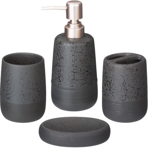 Набор аксессуаров для ванной комнаты состоит из дозатора для жидкого мыла, подставки-стакана, подставки для зубных щёток и мыльницы для кускового мыла.