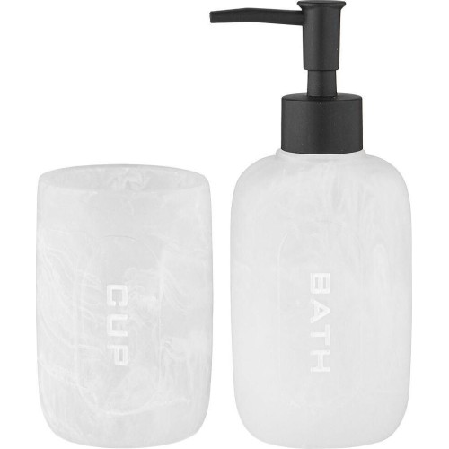 Набор аксессуаров для ванной комнаты состоит из дозатора для жидкого мыла и подставки-стакана.