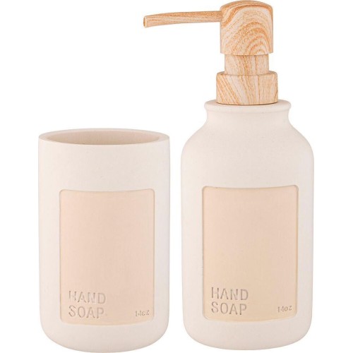 Набор аксессуаров для ванной комнаты состоит из дозатора для жидкого мыла и подставки-стакана.