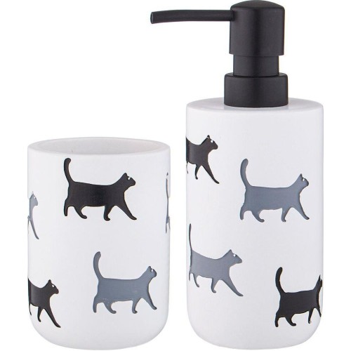 Набор аксессуаров для ванной комнаты состоит из дозатора для жидкого мыла и подставки-стакана.