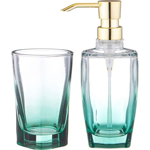 Набор аксессуаров для ванной комнаты состоит из дозатора для жидкого мыла и подставки-стакана.