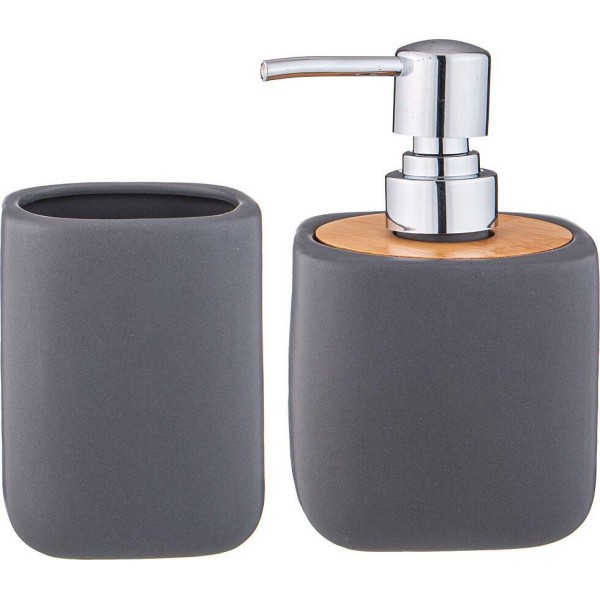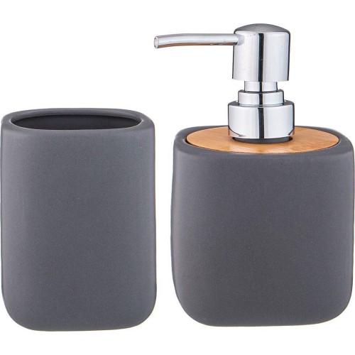 Набор аксессуаров для ванной комнаты состоит из дозатора для жидкого мыла и подставки-стакана.