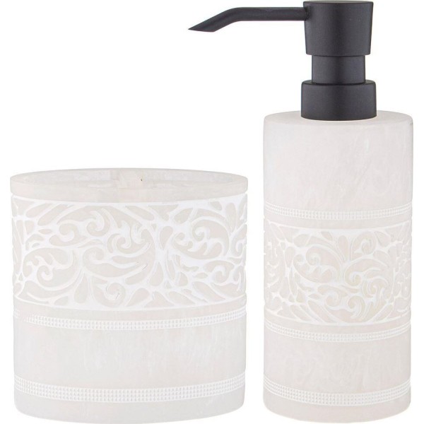 Набор аксессуаров для ванной комнаты состоит из дозатора для жидкого мыла и подставки-стакана.