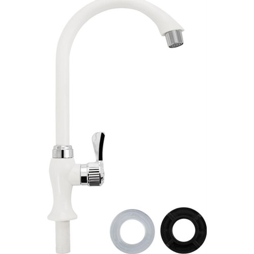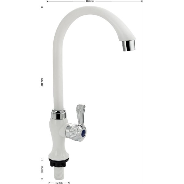 Кран на одну воду на раковину из высокопрочного пластика АБС - белый с аэратором для экономии воды. Крепление резьба - гайка. Кранбукса м/к, ручка - крест, поворот на 90. Габаритные размеры: высота 310 мм, длина 200 мм, диаметр посадочного седла 50 мм, длина резьбы 40 мм. Вес - 0,27 кг, объ м - 0,0017 м3. В комплекте корпус, прокладка