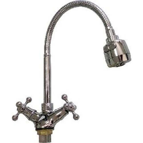 Смеситель для кухонной мойки и раковин, массивный корпус с гибким изливом, хромированный, с двухрежимным аэратором для экономии воды. Материал изготовления — ЦАМ (цинк-алюминий-медь) + нержавеющая сталь. Крепление резьба - гайка. Кранбукса м/к 1/2, ручка крест, поворот на 90˚. Габаритные размеры: высота 280 - 340 мм, длина 180 - 230 мм, диаметр посадочного седла 45 мм, длина резьбы 35 мм, длина подводки 350 мм. Вес - 1,100 кг, объём - 0,00317 м3. В комплекте корпус с изливом, паспорт, подводка 1/2, крепёж.