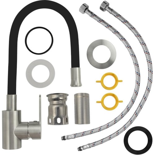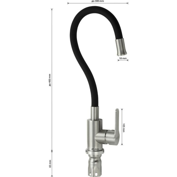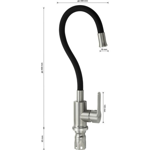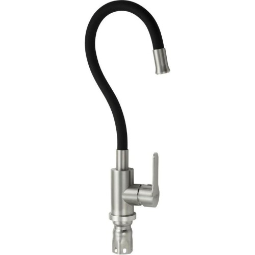 Смеситель для кухонной мойки и раковин, литой матовый корпус, из нержавеющей стали марки 304, с высоким гибким изливом чёрного цвета, с аэратором для экономии воды, шаровый. Крепление резьба - гайка, картридж d = 35 мм, ручка литая. Такая модель может использоваться на домашней кухне, на даче, в медицинских учреждениях и общественных местах. Габаритные размеры: высота до 400 мм, длина до 300 мм, диаметр посадочного седла 45 мм, длина резьбы 65 мм, длина подводки 400 мм. Вес - 2,100 кг, объём - 0,00421 м3. В комплекте паспорт, корпус с изливом, подводка 1/2, крепеж, набор прокладок.